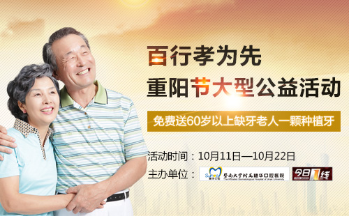 正值重阳节来临之际,为呼吁全社会敬老爱老,构建幸福广东、和谐社会,穗华口腔医院携手今日一线在10月11日—10月22日期间,开展“百行孝为先”的重阳节大型公益活动,提供免费赠送60岁以上缺牙老人一颗种植牙等优惠。