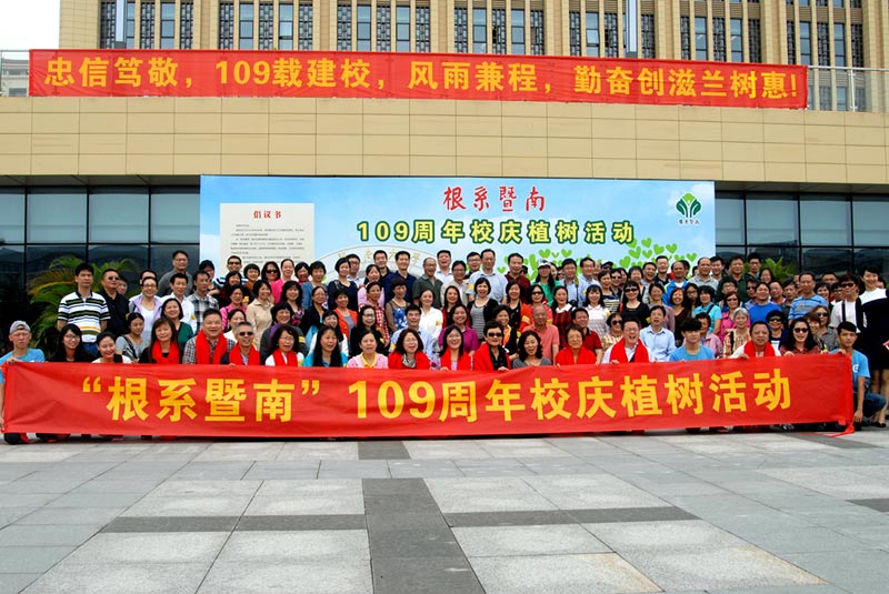 11月15日上午,由暨南大学校友会主办的109周年校庆系列活动之“根系暨南”植树活动在南校区举行。数百位85届校友代表在毕业三十年后重返母校,齐聚南校区,为校园再添新绿。