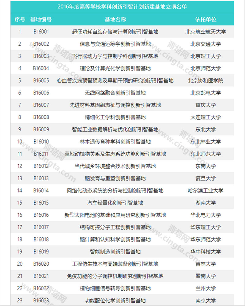 2016年度高等学校学科创新引智计划新建基地立项名单
