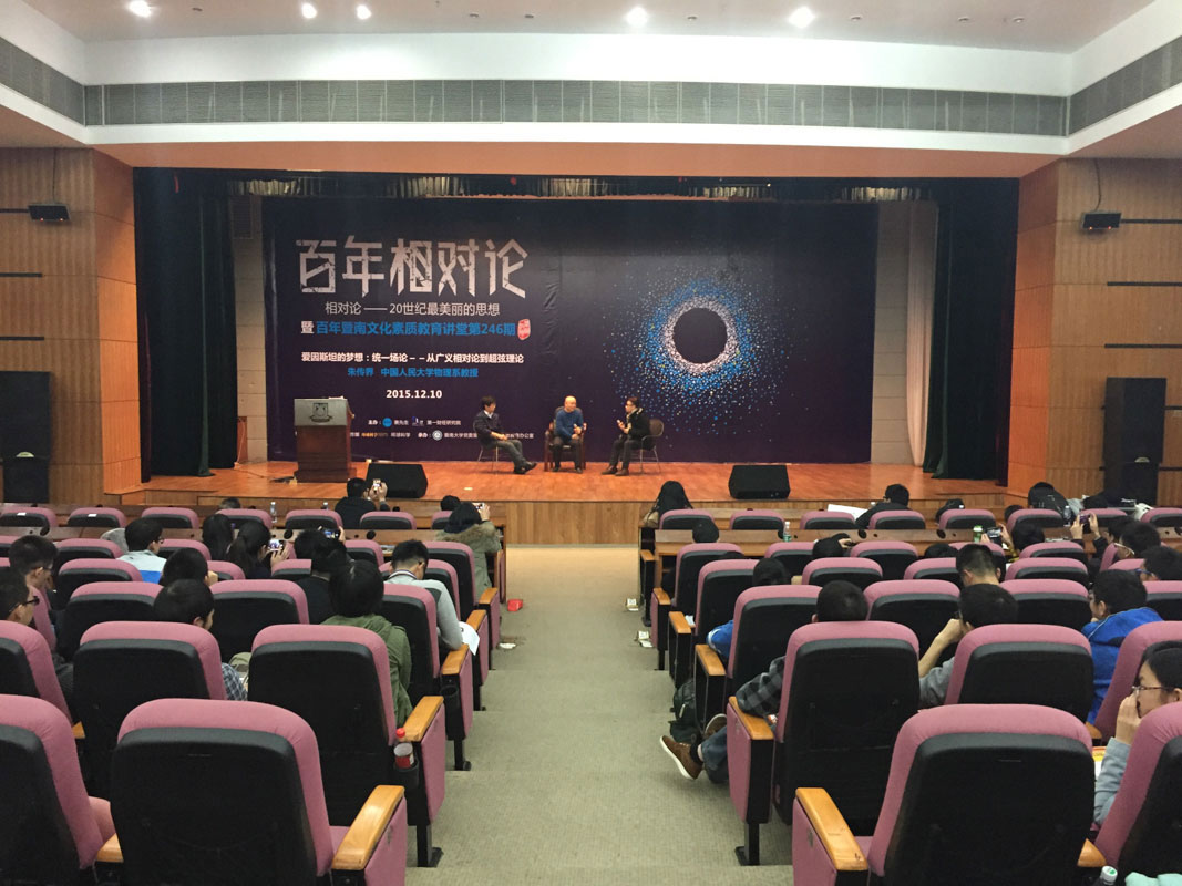 12月10日,中国人民大学物理系教授、着名理论物理学家朱传界做客百年暨南文化素质教育讲堂,在爱因斯坦发表广义相对论100周年的里程碑时刻,带领大家走进爱因斯坦的梦想,重温百年前那场改变人类文明进程的科学革命。