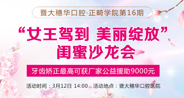 3月,春暖花开,木欣草荣;3月,是一个万物复苏,美丽绽放的月份;3月,是美丽春天的开端;3月,春天来了,你的笑容绽放了吗?一年之计在于春,想收获什么,就得先播种什么。3月12日穗华口腔医院· 正畸学院第16期“女王驾到 美丽绽放”主题闺蜜沙龙会,让我们一起在这个春天里种下美丽的种子。