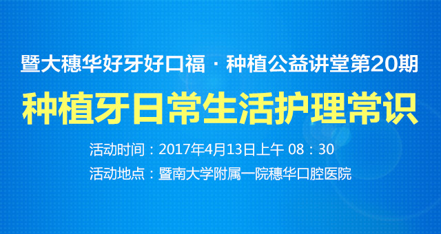种植牙就是重拾口福的开端,保养好种植牙,则是好口福的延续。为了不让种植牙提前下岗,2017年4月13日穗华口腔医院以“种植牙术后日常生活护理”为主题开展一场种植讲座,届时将由贺文鹏博士为广大种植牙患者详细讲解术后的日常生活护理常识,提高种植牙的使用质量。