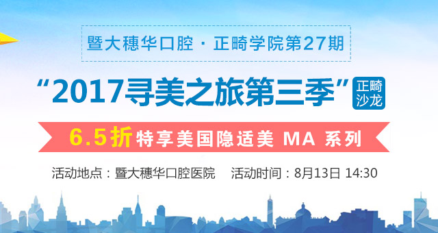 8 月 13 日,穗华口腔医院将举办正畸学院第27期“2017寻美之旅第三季”正畸沙龙,为广大正畸患者解疑释惑,量身定制个性化矫正方案,助歪牙改“斜”归正,让你展现美丽,重拾自信笑容。