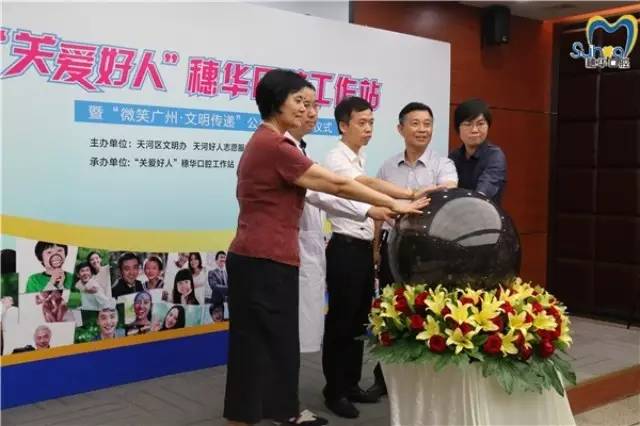 6月18日上午,广州市天河区人大常委会李宁佳副主任,天河区政协吴兰桂副主席,广州市文明办李滨处长,“关爱好人”穗华口腔工作站负责人,穗华口腔医院赖仁发院长,共同按动启动球,“微笑广州•文明传递”口腔健康大型公益活动正式启动!