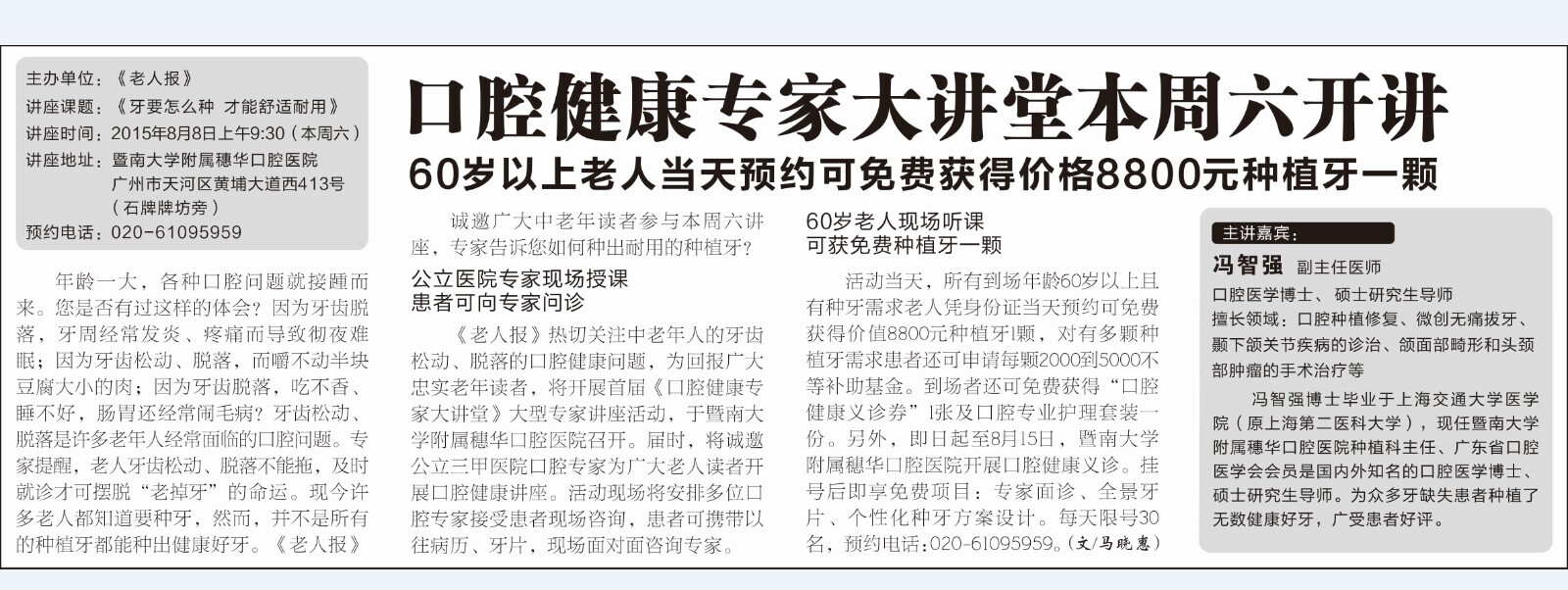 《老人报》热切关注中老年人的牙齿松动、脱落的口腔健康问题,为回报广大忠实老年读者,将开展首届《老人报口腔健康大讲堂》大型专家讲座活动,于穗华口腔医院召开。届时,将诚邀公立三甲医院口腔专家为广大老人读者开展口腔健康讲座。活动现场将安排多位口腔专家接受患者现场咨询,患者可携带以往病历、牙片,现场面对面咨询专家。
