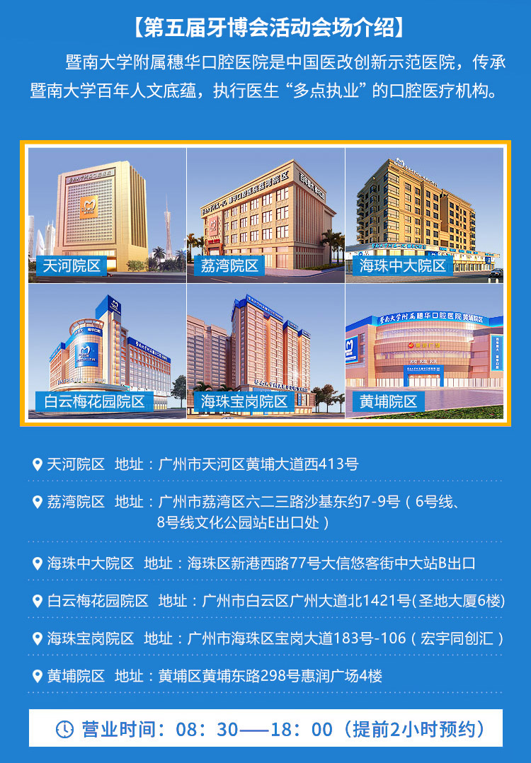 牙博会是由国内外知名口腔健康产业链品牌厂家联袂主办,以广州穗华口腔医院为指定技术支持单位,迄今已成功举办四届,作为行业内共瞩的口腔盛事,将助力广大市民实现口腔健康、全身健康,助力广大市民实现“开怀笑,畅快吃”。活动时间:即日起至2021年1月31日